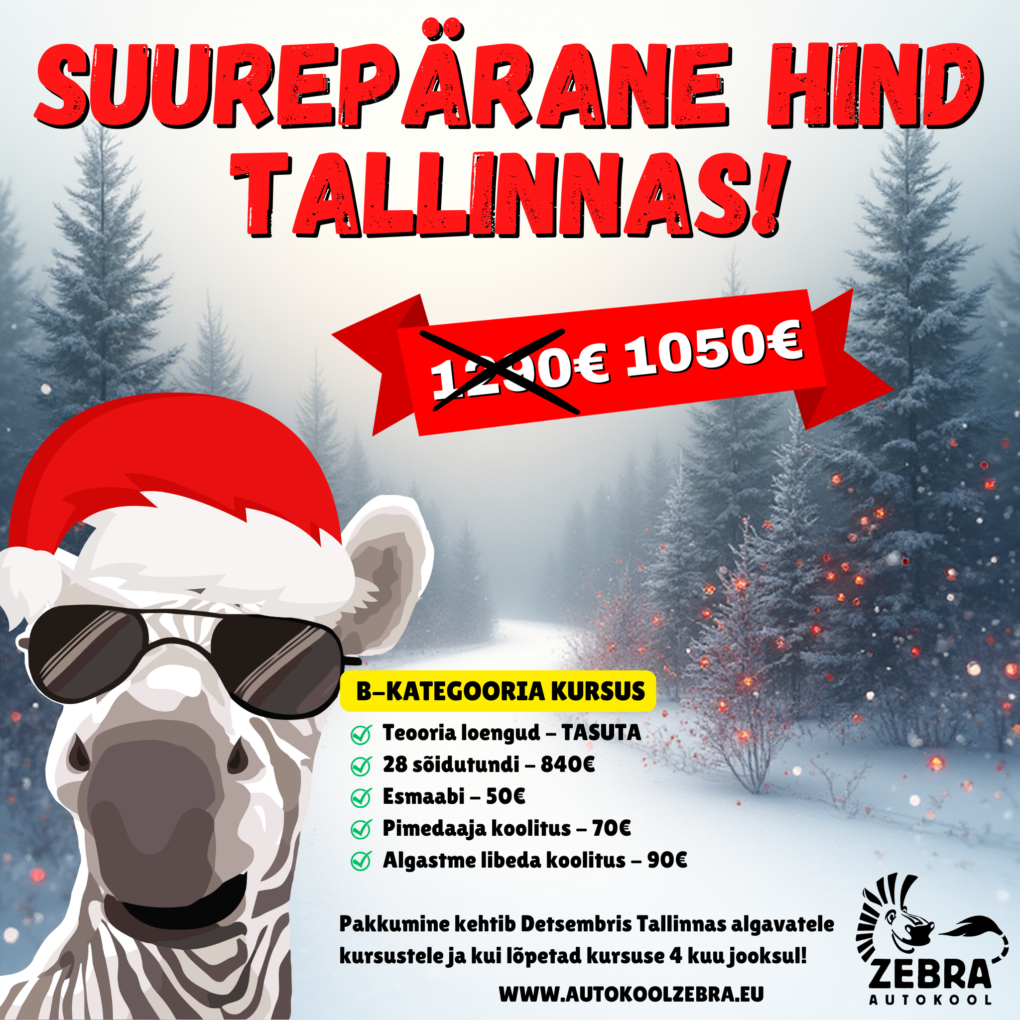 Tere tulemast Zebra Autokooli kodulehele! Meie autokool on professionaalne ning pühendunud sõidu- ja liiklusõppe pakkuja, kes tegutseb mitmes Eesti linnas – Tartus, Tallinnas, Pärnus ja Raplas. Oleme võtnud oma südameasjaks tagada igale õpilasele individuaalne lähenemine, et tagada parim võimalik juhendamine ja edukas lõpptulemus.